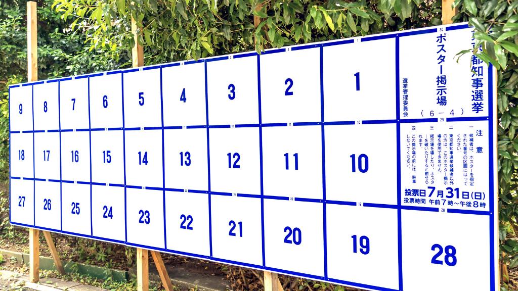 候補者は、ご自身の立候補届出順位の番号と同じ番号の書かれている区画に、ポスターを貼ることができます。